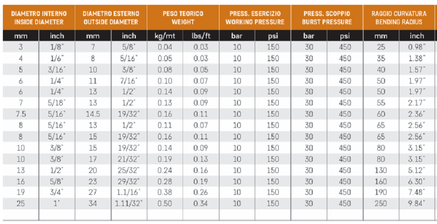 Rinforzi/Copertura: treccia di filato di cotone nero vul canizzata e impregnata con soluzione di neoprene, che rende il tubo autoestinguente e antiputriscibile.
